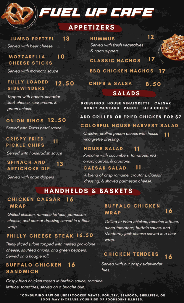 Stop by our Pitstop Grill for some classic fan favorites! With our delicious appetizers, cool salads, tasty burgers, classic handhelds, signature pizzas, delicious desserts, and assorted beverages – there’s something for everyone.
