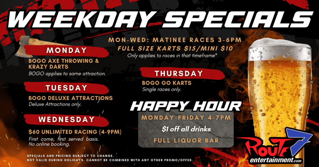Looking for a great deal? Be sure to check out our Weekday Specials for great offers, that will keep you coming back for the fun and the discounts! Afterall, who doesn’t like a BOGO deal?